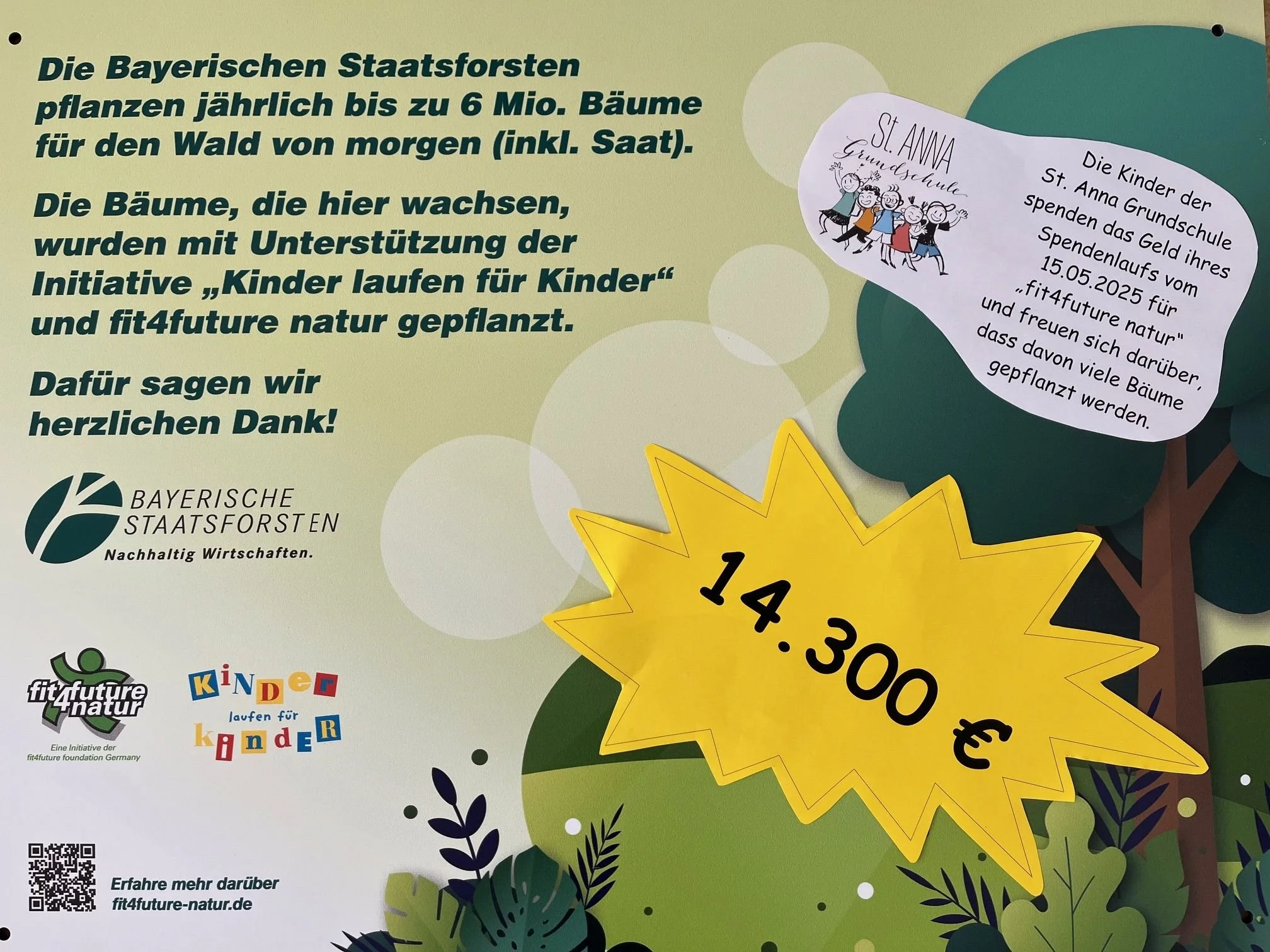 Auch im vergangenen Schuljahr 2024/25 haben sich unsere Schülerinnen und Schüler dazu entschlossen, wieder einen Spendenlauf durchzuführen. In einer schulinternen Abstimmung haben sich die Kinder für die fit4-future-Natur-Foundation entschieden (fit4future natur) und sagenhafte 14.300.- € erlaufen. Wir freuen uns, dass davon unglaublich viele Bäume gepflanzt werden können. Auch für das Schuljahr 2025/26 planen wir wieder einen Spendenlauf. Auf Wunsch der Kinder soll der Erlös an die Klinikclowns gehen.